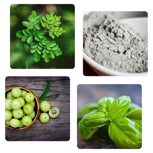 Made pure with the goodness of nature's powerful ingredients, such as Moringa Leaf, Basil Leaf, Bentonite Clay, and Amla.